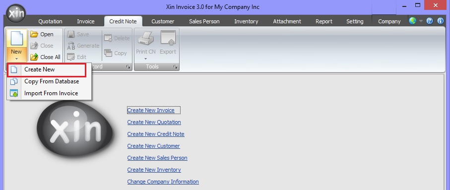 1. In Xin Invoice 3.0 program, click on "Invoice" tab on the top menu to open Credit Note page.